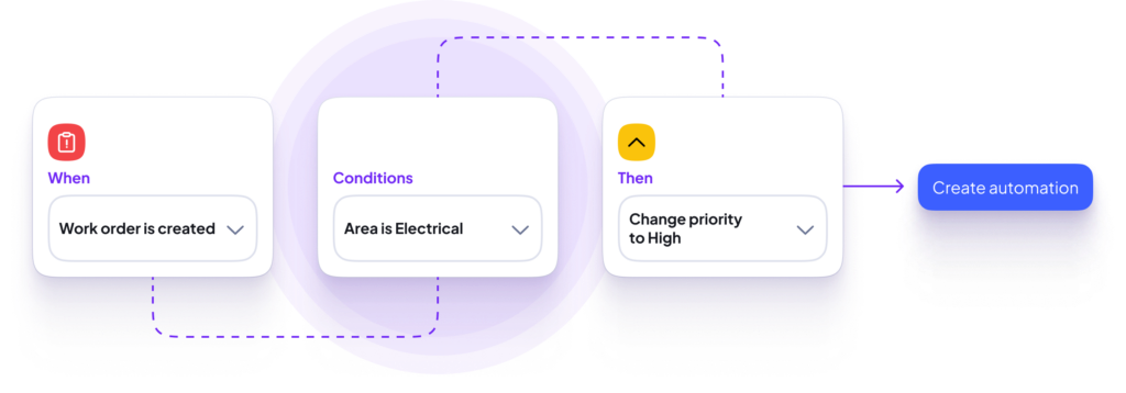 Resultados: ¿qué quieres que ocurra como resultado de tu automatización? Ejemplo: «Cuando se crea una orden de servicio con la categoría de activo X en el edificio Y, ¡establece la prioridad como urgente!».